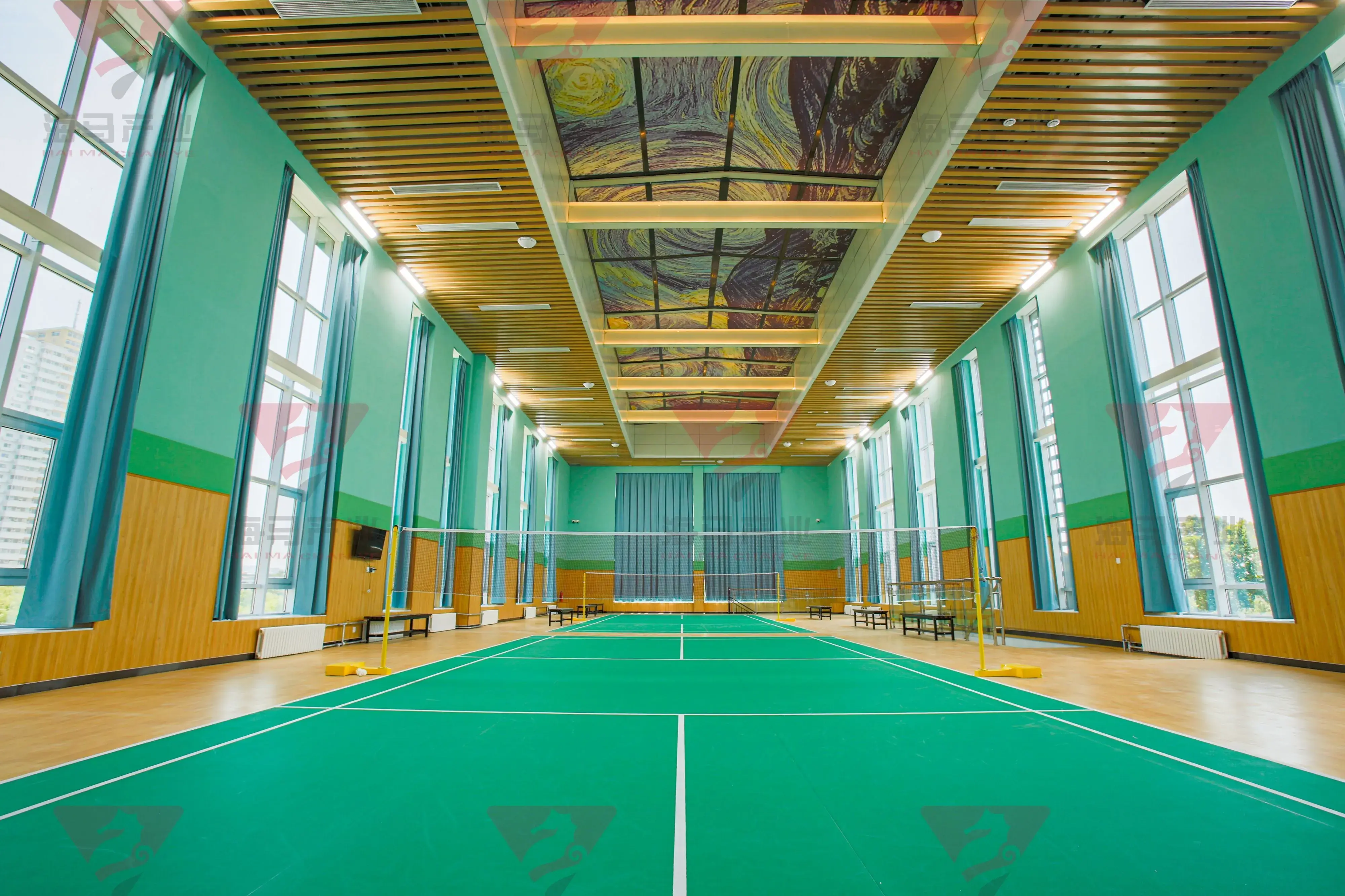 四层羽毛球场地380㎡,共设东西2片羽毛球场地,本场地顶面为铝方通吊顶+透明天窗,透明天窗具备电动开关功能,封闭状态下采用梵高《星空》素材,设计精妙,引人入胜。场地灯光专业羽毛球定制灯光,南北两侧各8个,共十六个。